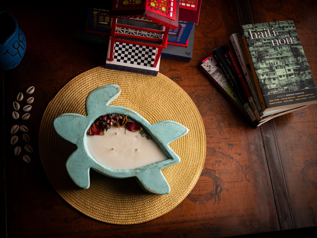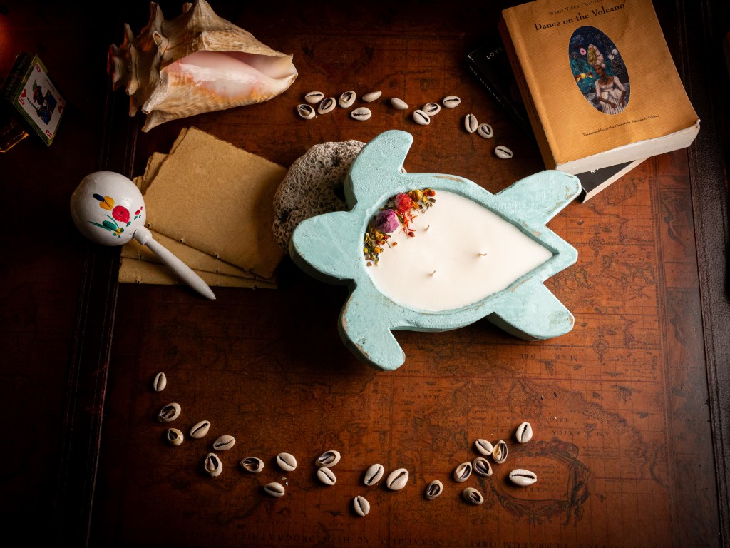You take in the tall tropical trees with slightly bruised fruits at their feet, the noisy birds whose chirps must be raving about the view from up there, and the waves, always the waves. The spirals that surround you catch your attention, and you point out how they reflect Audre Lorde’s own writing and philosophy. Beach merchants offer bright, colorful displays of fruits, herbs, and greens that create the top notes of this scent, Grapefruit, Mandarin, Lemon, Chamomile, and Lavender.