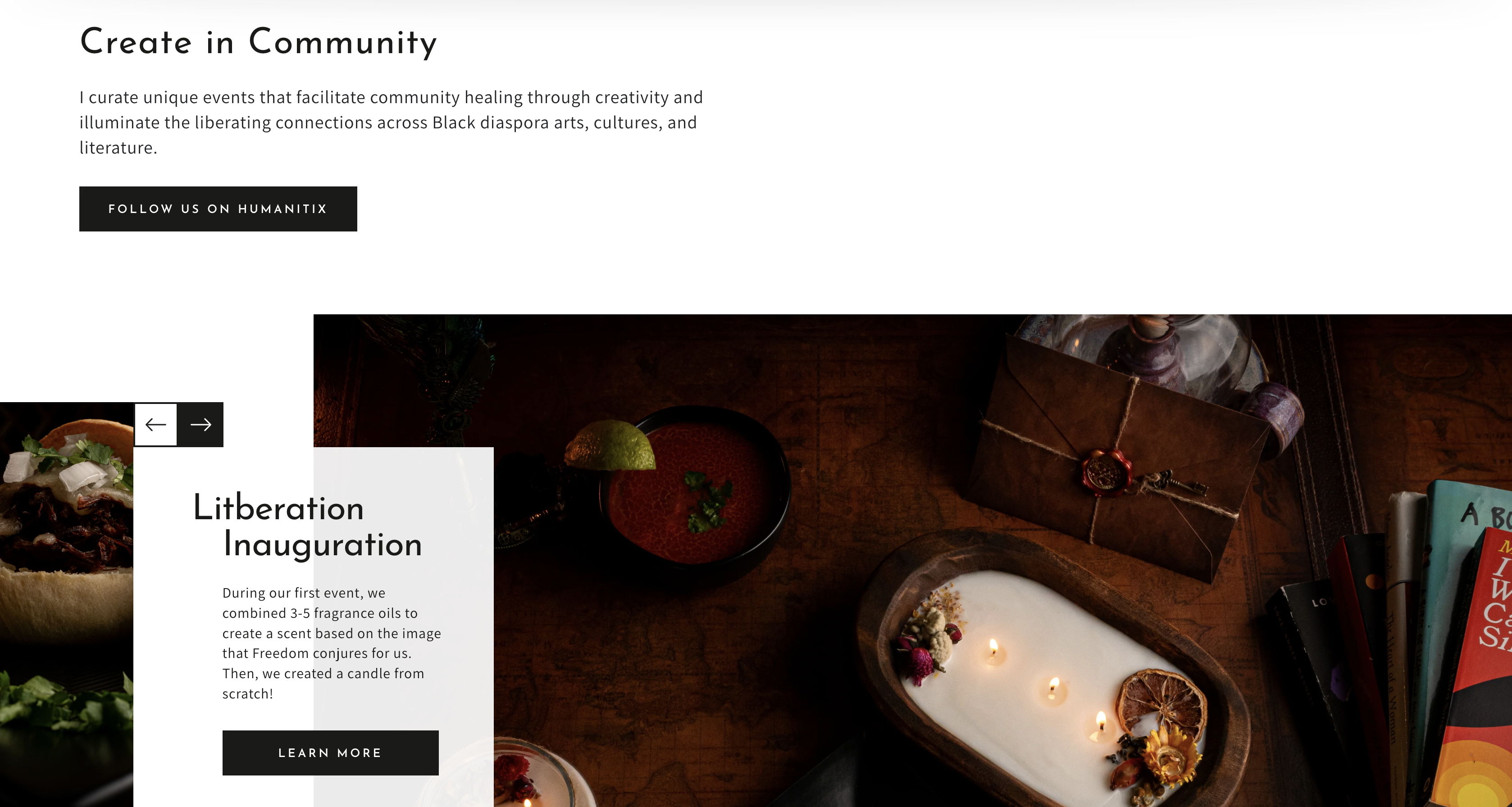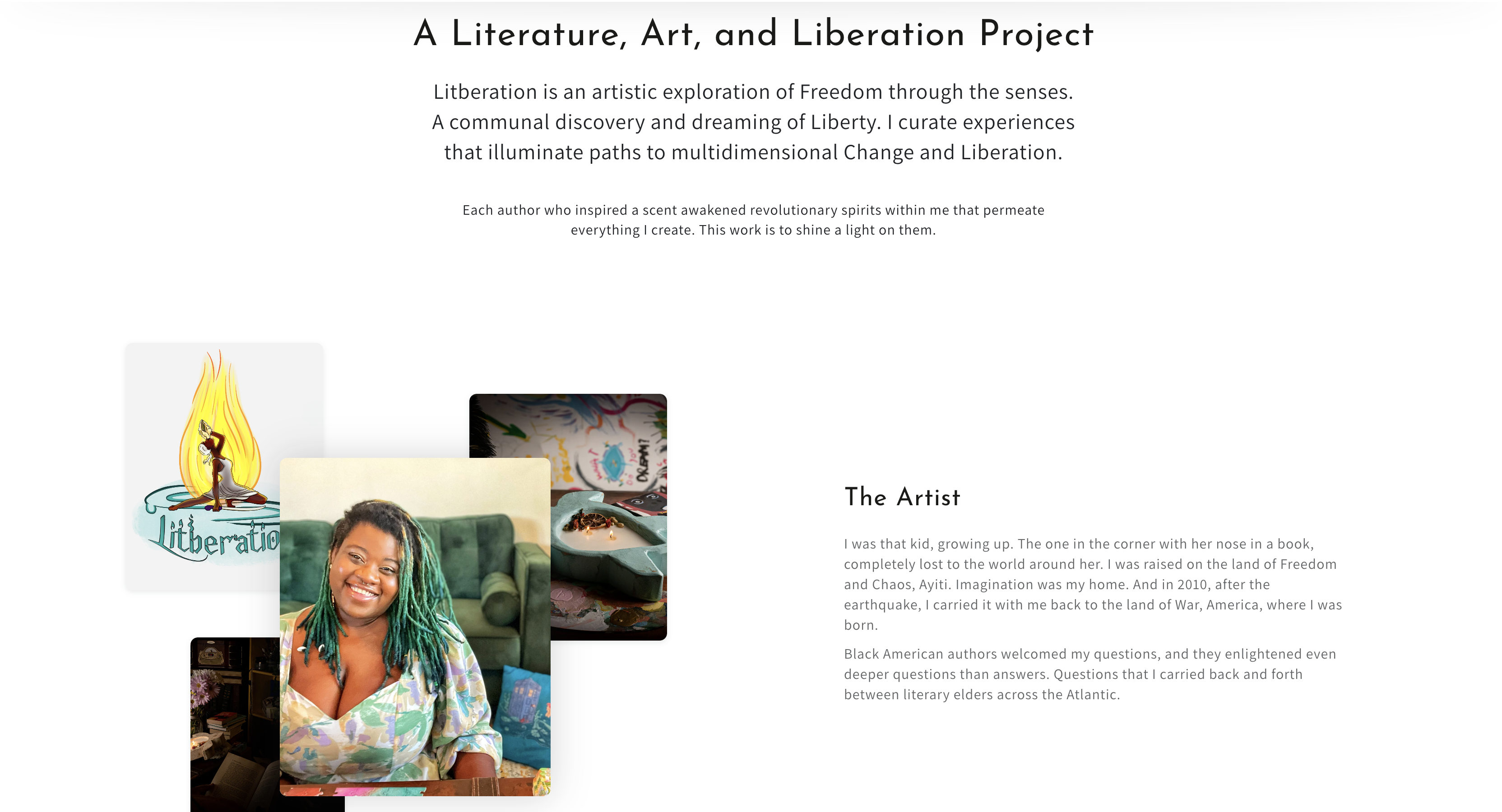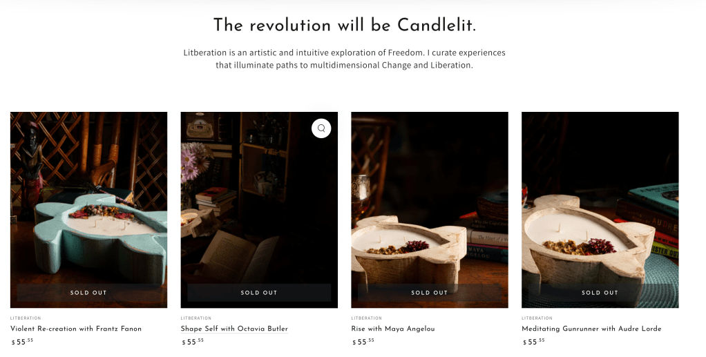 Litberation is an arts boutique and unique events curation service that I founded in 2024. The store currently offers handcrafted candles that release custom blended fragrances that are inspired by a dream meeting with 8 of my favorite authors.
