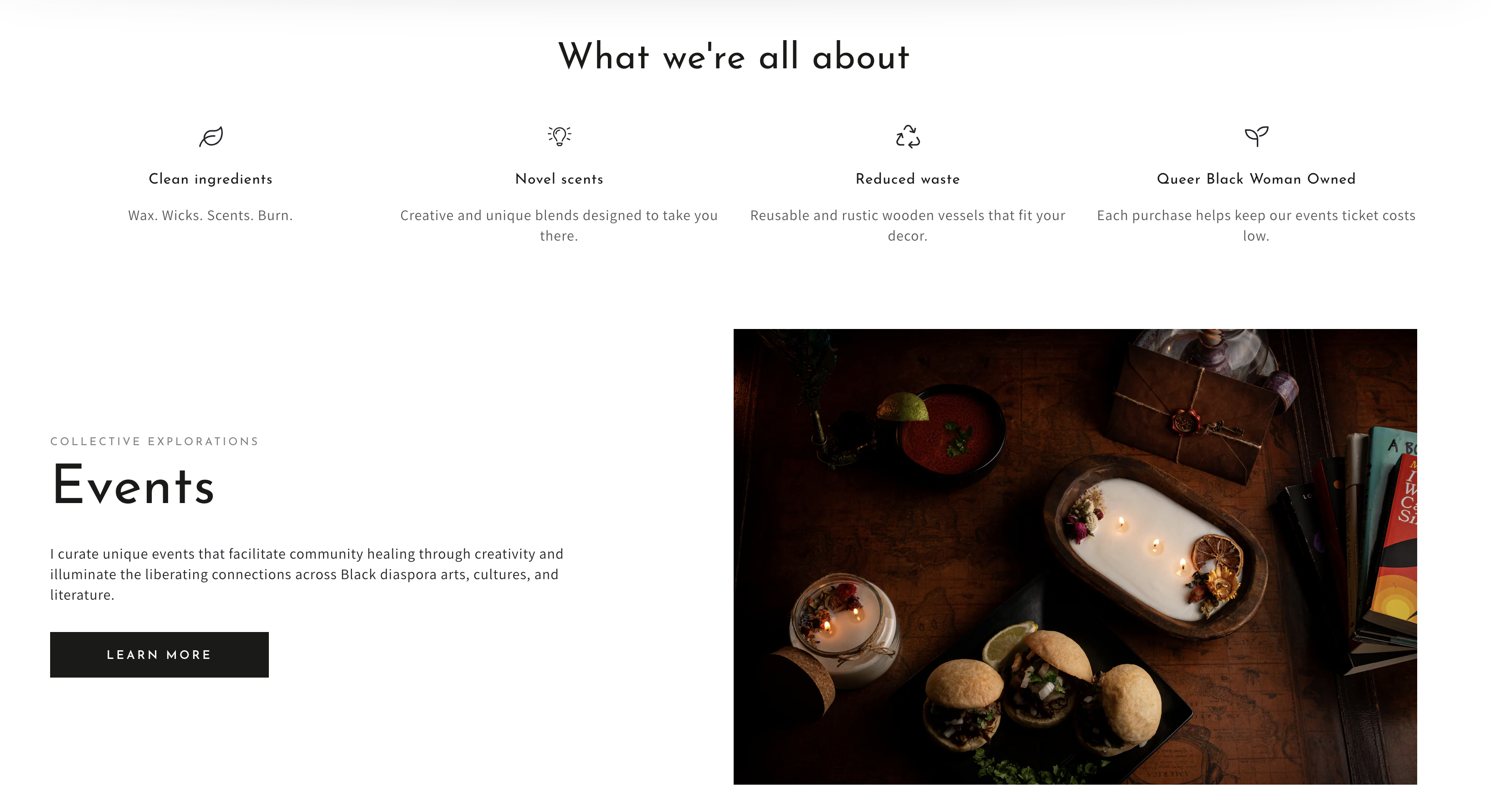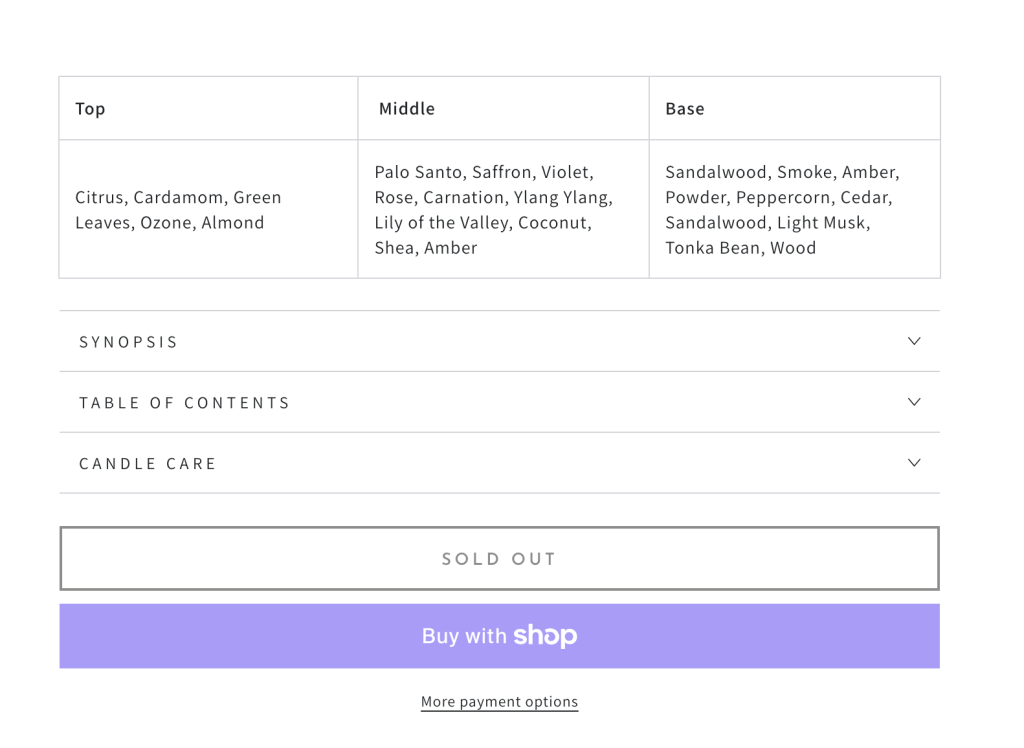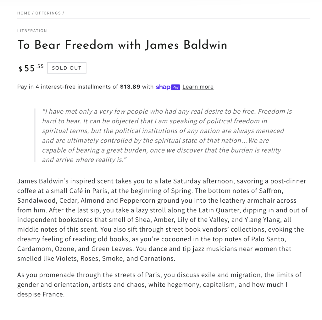 For example, James Baldwin’s inspired candle is titled “To Bear Freedom”. Each candle title emerges from a quote I selected, which introduces the product description on the product page.
